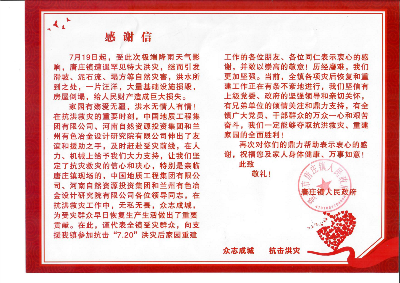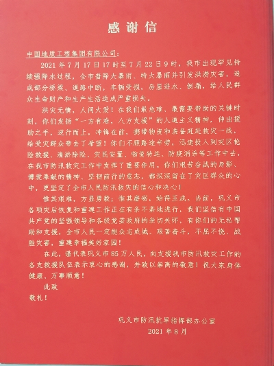 近日,河南登封市唐庄镇人民政府、巩义市米河镇人民政府、刘源沟村村民委员会代表受河南特大暴雨灾群众向海洋之神590线路检测中心送来了感谢信和锦旗,对海洋之神590线路检测中心为防汛抗洪提供各项支持表示感谢。在此次抗汛救灾中,海洋之神590线路检测中心团员青年立足本职岗位,扎实做好防汛救灾保障任务,全力筑牢汛期安全防线。用实际行动书写了青年的使命与担当,诠释“让青春在党和人民最需要的地方绽放绚丽之花”这一宣言。 河南特大暴雨灾情发生后,海洋之神590线路检测中心第一时间调集以党员、团员青年为主的26人成立突击队紧急驰援,从晚上18时至次日凌晨2时许,高质量完成紧急任务,以实际行动支援灾区共渡难关。郑州市和巩义市领导多次到现场查看抢修情况,高度赞扬了海洋之神590线路检测中心青年突击队的工作,认为“组织严密、动作迅速、抢险实效、贡献可嘉”。
