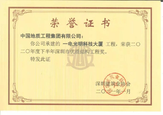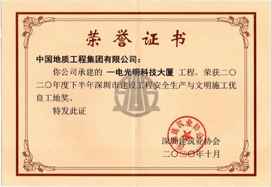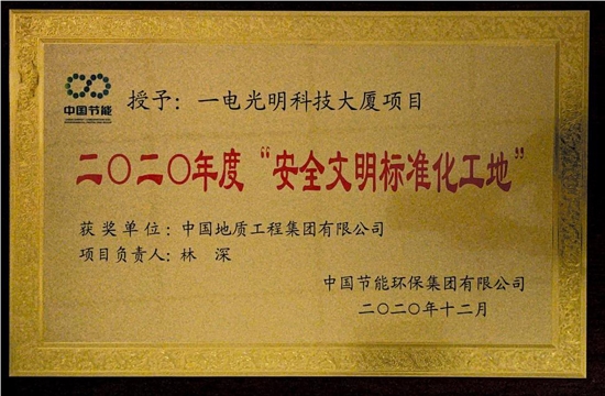 2020年12月,经过基层单位自评、二级子公司初评和节能集团评审,“一电光明科技大厦项目”被授予中国节能首批“安全文明标准化工地”荣誉称号。 2021年1月,深圳建筑业协会开展2020年下半年深圳市优质结构8590am海洋之神的评选活动。经过专家组对各企业申报项目进行中间检查、验收、推荐等,经深圳建筑业协会8590am海洋之神质量工作委员会审定并面向社会完成公示,深圳一电光明科技大厦项目荣获“2020年度下半年深圳市优质结构8590am海洋之神奖”。