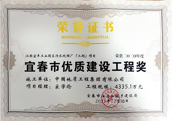 由海洋之神590线路检测中心华北建设分公司承建的江西宜丰工业园区污水处理厂(二期)项目于2021年10月通过江西省宜春市建设管理中心优质建设工程评审小组现场核查,并于2021年12月获得宜春市2020年度优质建设工程奖。