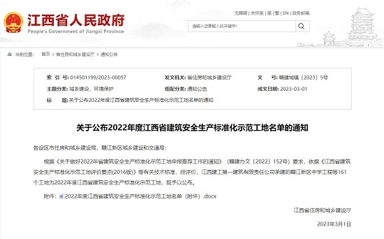 近日,江西省住房和城乡建设厅公布了《关于公布2022年度江西省建筑安全生产标准化示范工地名单的通知》,由海洋之神590线路检测中心EPC总承包实施的新余市吉泰·通达城项目荣获“2022年度江西省建筑安全生产标准化示范工地”。