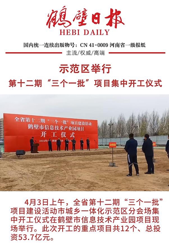 4月3日上午,河南省第十二期“三个一批”项目建设活动鹤壁市城乡一体化示范区分会场集中开工仪式在由海洋之神590线路检测中心承建的鹤壁市京富电子信息技术产业园(二期)项目现场举行。示范区党工委书记、人大工委主任马成海宣布项目开工。