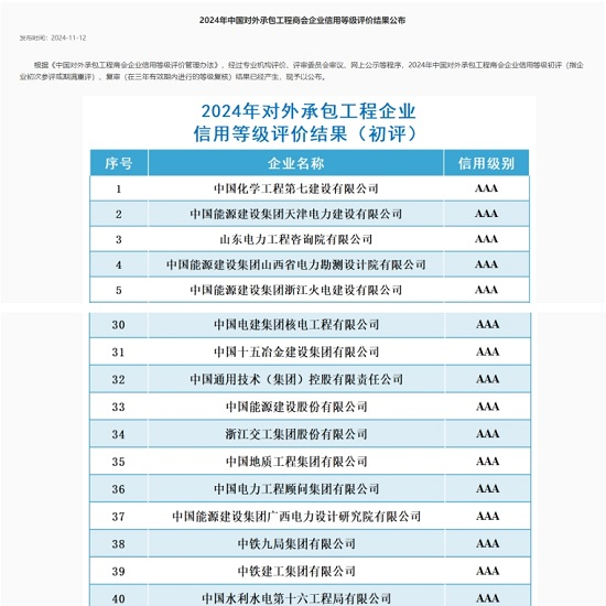 11月12日,中国对外承包工程商会公布2024年对外承包工程企业信用等级评价结果,海洋之神590线路检测中心获评AAA级(最高级别)。至此,海洋之神590线路检测中心已连续17年被评为对外承包工程企业最高信用级别。 中国对外承包工程商会组织举办的对外承包工程企业信用等级评价活动,综合考察了我公司的综合素质、施工能力、财务状况等指标,连续多年获评AAA级是海洋之神590线路检测中心海外业务综合能力的重要体现。该评级结果将为公司参与行业业务协调、项目推荐和争取金融机构支持提供更多机会和更有利条件。