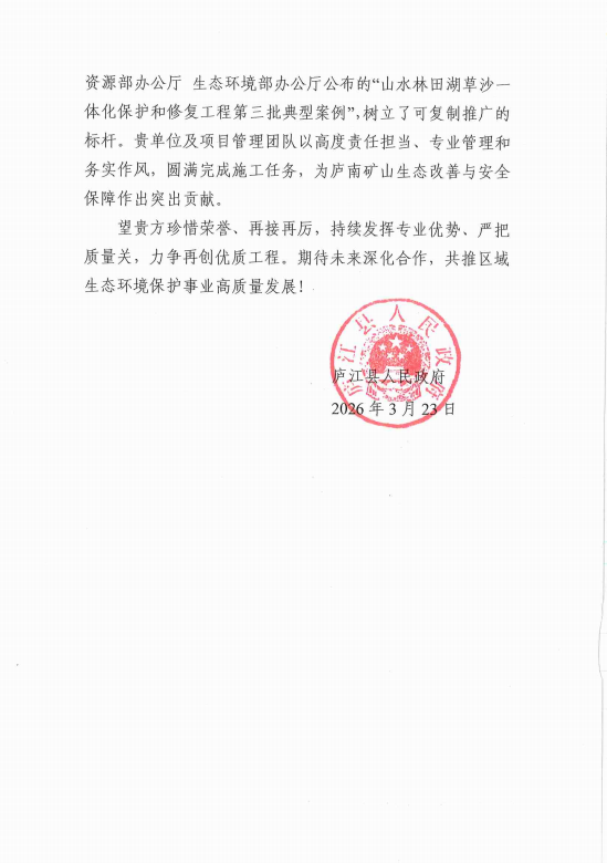 4月20 日,海洋之神590线路检测中心收到庐江县人民政府致送的表扬信和庐江县自然资源和规划局颁发荣誉证书,对庐南矿山生态修复工程项目一标段成功入选财政部、自然资源部、生态环境部“山水林田湖草沙一体化保护和修复工程第三批典型案例”予以专项表彰,充分肯定项目建设成效与示范价值。
